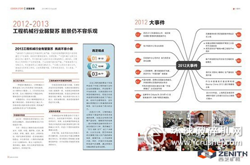 第二期《Made In ZENITH》依舊為中英雙刊,此次首先發(fā)行的是中文版。相較于首期“為客戶展現(xiàn)靈魂團隊”的視角,此期《Made In ZENITH》更為關注全球工程機械行業(yè)在身處困境時,西芝和其他中國企業(yè)如何迎接挑戰(zhàn),把握機遇。刊物就2013年行業(yè)環(huán)境和發(fā)展趨勢、行業(yè)動態(tài)、2012年西芝年度事件、2013年西芝創(chuàng)新舉措和已取得的成績一一進行了分析與詮釋。