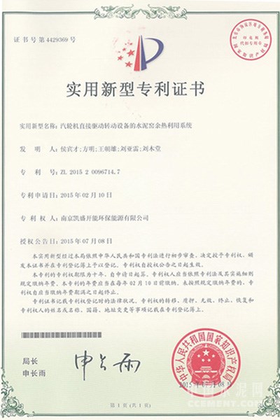 近日,南京凱盛開能環(huán)保能源有限公司科技成果“汽輪機(jī)直接驅(qū)動(dòng)轉(zhuǎn)動(dòng)設(shè)備的水泥窯余熱利用系統(tǒng)”實(shí)用新型專利喜獲中華人民共和國國家知識(shí)產(chǎn)權(quán)局授權(quán),該系統(tǒng)主要利用水泥窯余熱產(chǎn)生的過熱蒸汽直接驅(qū)動(dòng)高溫風(fēng)機(jī)、窯尾排風(fēng)機(jī)以及水泥磨等轉(zhuǎn)動(dòng)設(shè)備。這是公司獲得的第39項(xiàng)專利技術(shù)。