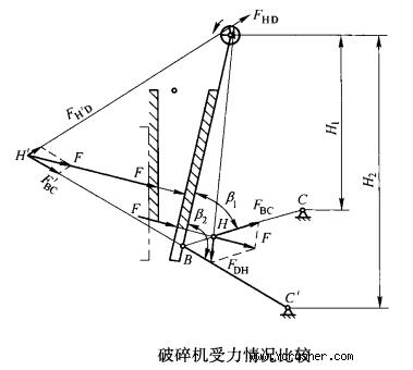 兩種破碎機除傳動角和肘板支點位置不同外,其他的都一樣,并按集中破碎力計算,H是傳統(tǒng)復(fù)擺顎式破碎機的受力圖,H’是上置式破碎機的受力圖。