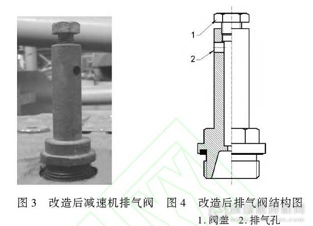 (3)將閥蓋改為螺紋連接當(dāng)排氣閥堵塞時(shí),可卸下排氣閥,擰下閥蓋進(jìn)行徹底清洗。為了減少排氣閥堵塞現(xiàn)象的發(fā)生,可定期對(duì)排氣進(jìn)行拆卸清洗。圖3改造后減速機(jī)排氣閥圖