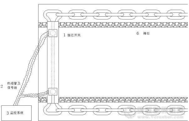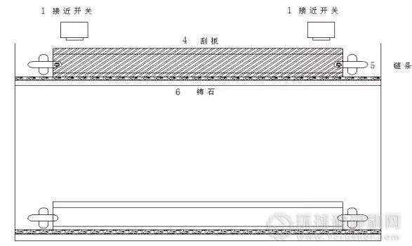 該刮板機(jī)的斷鏈掉鏈綜合保護(hù)裝置包括兩個接近開關(guān)、信號線路和監(jiān)控系統(tǒng)。其主要特征在于: