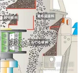 立軸沖擊式破碎機(jī)由進(jìn)料斗、吊架、渦流破碎腔、葉輪體、主軸、底座、傳動裝置及電機(jī)部分組成。其工作原理是:物料由進(jìn)料斗進(jìn)入葉輪腔內(nèi)(途經(jīng)吊架處中心進(jìn)料管),由分料錐把物料以傘狀形式均勻地拋于葉輪流道內(nèi),經(jīng)高速旋轉(zhuǎn)的葉輪瞬間加速至 60 — 75 米 / 秒,從葉輪周圍的流道腔內(nèi)拋射出去,沖擊到渦流腔內(nèi)渦流襯層上,被物料襯層反彈,斜向沖擊到渦流腔的頂部,又改變其運(yùn)動方向,偏轉(zhuǎn)向下運(yùn)動,和葉輪流道腔內(nèi)拋出的物料形成連續(xù)的物料幕。這樣,一塊物料在渦流破碎腔內(nèi)受到兩次至多次破碎撞擊,被破碎的物料由下部排料口排出,經(jīng)循環(huán)篩分系統(tǒng)形成閉路,一般循環(huán)三次即可將物料破碎成為 4.75mm 以下。這種破碎機(jī)優(yōu)點(diǎn)是破碎比與耐磨襯板的磨損無關(guān)。由于這種特性,任何物料一無論其耐磨性能如何都可以很經(jīng)濟(jì)的使用轉(zhuǎn)子離心式破碎機(jī)進(jìn)行破碎,獲得立方型顆粒含量.超過80%的高質(zhì)量產(chǎn)品。同時也提高了破碎面的比例。渦流腔內(nèi)部巧妙的氣流自循環(huán),消除了粉塵污染。溢流給料并不需要增加破碎機(jī)的功率消耗和磨損費(fèi)用,溢流給料增加了破碎機(jī)腔內(nèi)部的顆粒密度,更有效的破碎更多的顆粒,提高了能量利用率。