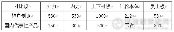 沖擊式破碎機(jī)的使用壽命原來就比其他類型的破碎機(jī)低,如顎式、圓錐式等。而立軸沖擊式又比臥式?jīng)_擊式使用工況更惡劣。因此,機(jī)器零部件的使用壽命,是VSI機(jī)制造商的生命線,在相仿的使用工況下,對零件壽命作一對照(見表2.3.1)