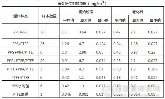 從表2可見,在試驗條件下,濾料本身的粉塵排放濃度是極低的。初始階段(潔凈濾料,30個清灰周期)的平均排放濃度絕大部分濾料不到1.5mg/m3,老化試驗結(jié)束后,所有濾料的平均濃度不到0.5mg/m3,遠低于現(xiàn)場運行的袋式除塵器或電袋復合除塵器的排放濃度。