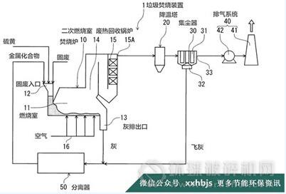 焚燒爐10含燃燒室11,上端設(shè)垃圾入口12,下端設(shè)灰分排出口13、二次燃燒室14、并連接廢熱回收鍋爐15。