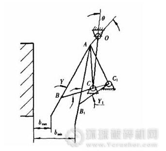 這里我們要討論的傳動(dòng)角與排料口之間的關(guān)系,是指根據(jù)產(chǎn)品粒度要求,排料口的尺寸值從最小到最大變化與傳動(dòng)角的關(guān)系。