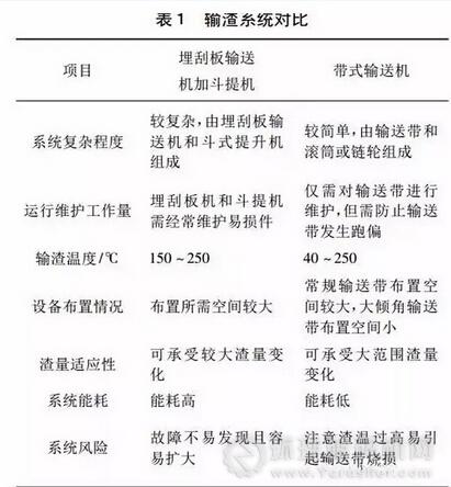 輸渣系統(tǒng)對比見表1。