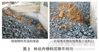 我們根據(jù)石灰石中的鈣含量,通常每車潔凈石灰石(約55t)按 1~2 鏟與巖溶填充物進(jìn)行拋撒搭配,搭配比例約在 6%。 破碎料坑容積約 300m3,但因運(yùn)礦車單側(cè)卸料,只能裝納 4 車物料,約 200t。 從現(xiàn)場(chǎng)觀察來(lái)看,破碎料坑上部為直段,下部呈倒喇叭口狀(錐形)。卸料后,料坑內(nèi)物料表層呈一定坡度(見圖 2)。由于料坑高度原因,當(dāng)料坑運(yùn)礦車卸料側(cè)物料與卸料口水平時(shí),料坑另一側(cè)物料剛好淹沒料坑下部(重型板式喂料機(jī)上方)進(jìn)料口。 此時(shí)搭配的巖溶填充物在料坑下部錐形口處隨著重型板式喂料機(jī)輸送而快速收縮聚集在一起,因此,未起到均勻沉降的效果(見圖 2)。隨著料坑下部進(jìn)料口露出,此種現(xiàn)象更為明顯。 當(dāng)集中的巖溶填充物輸送至破碎機(jī)內(nèi), 由于其黏性較強(qiáng)(沉積巖尤為突出),篦板間隙小,進(jìn)入破碎機(jī)后附著在篦板以及破碎機(jī)內(nèi)部,造成堵塞篦孔制約生產(chǎn)。因此,盡量使料坑內(nèi)物料充足,避免料坑下部進(jìn)料口露出,應(yīng)該采取一層潔凈石灰石與一層巖溶填充物的搭配方式,通過上部物料擠壓,沉降均勻,再通過重型板式喂料機(jī)輸送至破碎機(jī)內(nèi)才能起到最佳均化效果,破碎機(jī)工況將會(huì)大大提升。