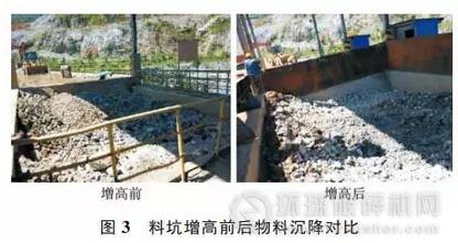 1)對(duì)進(jìn)料坑進(jìn)行擴(kuò)容處理,將料坑整體升高1.5m。增高后料坑容積從原來(lái)的 300m?增加至 420m?,能多卸料 3 車,使?jié)崈羰沂c巖溶填充物能充分沉降混合。料坑增高前后對(duì)比見圖 3。