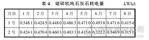 3)1 號(hào)和 2 號(hào)破碎機(jī)噸石灰石耗電量在料坑增高以后均呈下降趨勢(shì),2 號(hào)破碎機(jī)尤為明顯,見表 4。