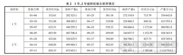 1)2015 年 1 號(hào)和 2 號(hào)破碎機(jī)在 6 月份料坑增高后單套錘頭破碎產(chǎn)量明顯增加,1 號(hào)破碎機(jī)連續(xù)兩套錘頭均達(dá)到 80 萬(wàn)噸,2 號(hào)破碎機(jī)使用的兩套錘頭更是達(dá)到了 98 萬(wàn)噸和 111 萬(wàn)噸。單套錘頭產(chǎn)量幾乎翻番,經(jīng)濟(jì)效益十分明顯。1 號(hào)和 2 號(hào)破碎機(jī)錘頭使用情況見表 2。