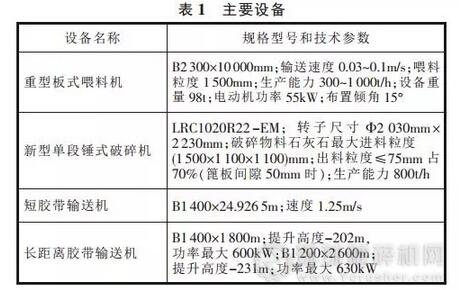 錘式破碎機(jī)內(nèi),再由短膠帶輸送機(jī)將破碎后的物料轉(zhuǎn)送到長(zhǎng)距離膠帶輸送機(jī)。工藝流程和主要設(shè)備見圖 1 和表 1。