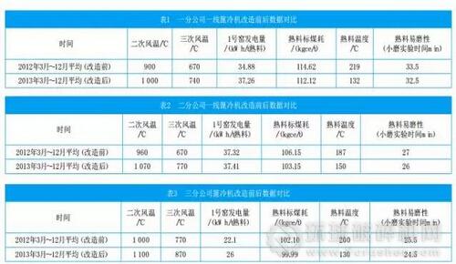 表1、表2、表3分別為一分公司一線篦冷機(jī)、二分公司一線篦冷機(jī)、三分公司篦冷機(jī)改造前后數(shù)據(jù)對(duì)比。