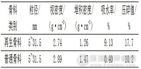 我國(guó)的混凝土構(gòu)筑物,混凝土強(qiáng)度等級(jí)多在C30以下。工程材料混合物中,骨料通常起骨架作用,很大程度上決定著混合物的輕度性能和耐久性能。其對(duì)強(qiáng)度的影響主要有兩方面:一是自身強(qiáng)度的影響;二是對(duì)界面結(jié)合的影響,而對(duì)耐久性的影響則是多方面的。混凝土再生骨料與普通骨料的性能列于表1。