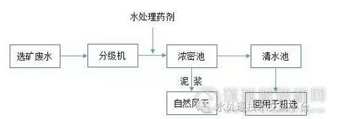 分級機(jī)去除大部分粗砂后溢流至濃密池,在分級機(jī)到濃密池的溢流管道中分別加入兩種水處理藥劑來加快沉淀,在濃密池大部分懸浮物在藥劑的作用下沉到底部,濃密池溢流液自流到清水池并回用于粗選;濃密池底部的泥漿緩慢排到自然干化池,自然風(fēng)干后用鏟車運(yùn)走。