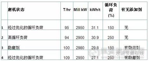 表格中的范例概述了對(duì)采用第三代選粉機(jī)Sepax選粉機(jī)和第2倉(cāng)應(yīng)用小粉磨介質(zhì)(15-30mm,20mm)的FLS磨機(jī)開(kāi)展的一系列測(cè)試情況。在第一種條件下,高物料填隙率限制了最佳循環(huán)負(fù)荷的大小,強(qiáng)行提高循環(huán)負(fù)荷(第2種條件)不能帶來(lái)效益。第3種條件是在現(xiàn)有的最佳循環(huán)負(fù)荷下采用傳統(tǒng)助磨劑的情況,在這種條件下,助磨劑所帶來(lái)的好處相對(duì)不大(提高6%)。不過(guò),使用助磨劑改善了一系列磨機(jī)條件,降低了磨機(jī)物料填隙率,提高了選粉機(jī)的選粉效率,減少了糊球。因此得到利用高循環(huán)負(fù)荷和應(yīng)用助磨劑帶來(lái)的好處(第4種條件)。因此,采用助磨劑以及重新確定最佳循環(huán)負(fù)荷,可以顯著提高效益,提產(chǎn)達(dá)到15%。