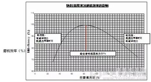 對(duì)于任何一個(gè)閉路球磨系統(tǒng)而言,均存在一個(gè)最佳循環(huán)負(fù)荷對(duì)應(yīng)最大磨機(jī)產(chǎn)量和最小功率消耗(kWh/t)。增加循環(huán)負(fù)荷可以減少入磨細(xì)粉量,減少細(xì)粉在磨內(nèi)團(tuán)聚的影響。不過(guò),循環(huán)負(fù)荷的增加,會(huì)增加磨機(jī)的物料總通過(guò)量,和選粉機(jī)的負(fù)荷,從而降低選粉機(jī)的選粉的效率同時(shí)會(huì)增大磨機(jī)的物料填隙率,降低磨機(jī)的粉磨效率(當(dāng)超過(guò)85%的最佳填隙率時(shí))。在一定循環(huán)負(fù)荷下,必須通過(guò)試驗(yàn)確定最佳物料填隙率,同時(shí)該值取決于很多參數(shù),包括:磨機(jī)直徑;磨內(nèi)風(fēng)速;選粉機(jī)的效率;粉磨介質(zhì)大小;助磨劑,一倉(cāng)的