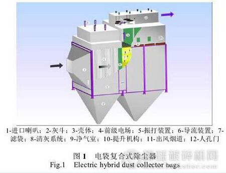 電袋復(fù)合除塵器是在一個(gè)箱體內(nèi)將電除塵和袋式除塵器有機(jī)結(jié)合在一起的新一代高效除塵設(shè)備。電袋復(fù)合除塵技術(shù)結(jié)合了電除塵和袋除塵的優(yōu)點(diǎn),其機(jī)理為“荷電收塵”和“攔截過(guò)濾”。在電場(chǎng)內(nèi)以較小的能耗去除80%左右的粗顆粒粉塵,減輕濾袋的粉塵負(fù)荷;利用荷電粉塵顆粒之間的電凝并作用改善了粉塵層的特性,產(chǎn)生了新的荷電粉塵過(guò)濾特性機(jī)理:異性電荷顆粒電凝并形成大顆粒粉塵,提高細(xì)微顆粒捕集率;同性電荷相互排斥,迅速擴(kuò)散,形成均勻分布的氣膠懸浮狀,使達(dá)到濾袋表面的粉塵排列規(guī)則有序、蓬松,透氣性好,粉塵層孔隙率高,剝落性好。因此采用較低的清灰壓力(0.25MPa),能夠達(dá)到較理想的清灰效果,從而延長(zhǎng)了濾袋的清灰周期和濾袋的使用壽命。