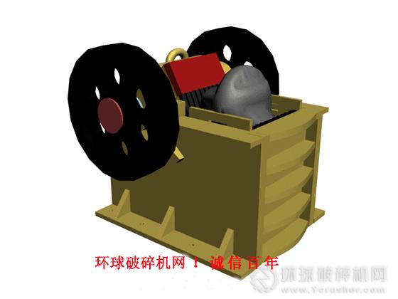 電機(jī)通過三角皮帶將動力傳遞給偏心軸端的皮帶輪,使偏心軸在電機(jī)的帶動下,按規(guī)定的速比作旋轉(zhuǎn)運(yùn)動,動鄂頭在偏心軸偏心力的推動下相對定鄂板做有規(guī)律的固定軌跡擠壓運(yùn)動從而實(shí)現(xiàn)物料的破碎。