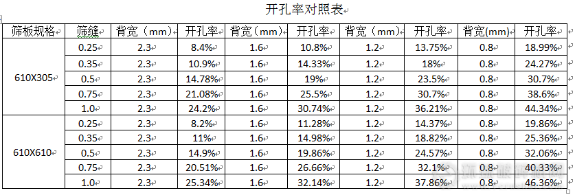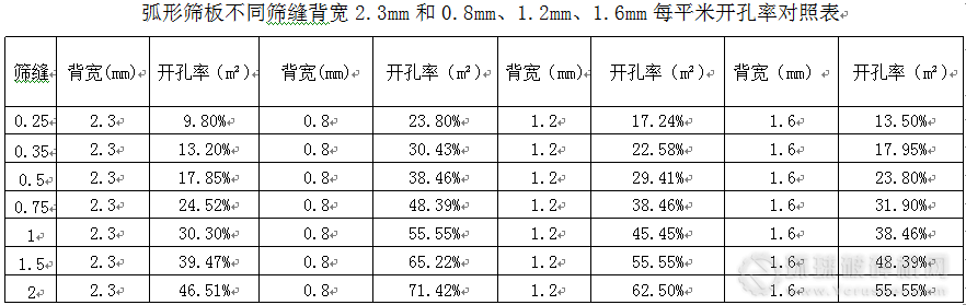 新型高效弧形篩板具有開孔率高、重量輕、耐磨性好、壽命高等優(yōu)點,特別是開孔率較傳統(tǒng)的開孔率提高1倍以上(開孔率對比見下表1),脫水脫介效果好。對于振動弧形篩,安裝高效弧形篩板后,不開振動電機,脫水效果也能達(dá)到工藝要求,從而可以降低介耗、電耗。篩板重量變輕也便于更換,減輕了工人更換時的勞動強度,降低篩機負(fù)荷,并延長篩機使用壽命。