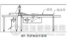 在覆膜濾袋的縫制過(guò)程中,必須特別注意對(duì)濾料表層薄膜的保護(hù),盡最大可能避免損傷。在外濾式袋身的三線鏈?zhǔn)娇p制過(guò)程中,由于是直縫縫制,袋身會(huì)被迅速推到操作臺(tái)面,這樣,濾袋的覆膜表面與操作臺(tái)面間就會(huì)形成摩擦,并極有可能損傷覆膜。為了解決這一問(wèn)題,應(yīng)采用與縫制速度相匹配的同步輸送裝置。該裝置與縫紉機(jī)的啟停同步,即縫紉機(jī)工作與側(cè)輸送帶的速度匹配,使濾袋的覆膜表面與輸送帶表面之間相對(duì)靜止,避免了摩擦損壞。當(dāng)縫紉機(jī)停止工作時(shí),則輸送帶也同步停止(如圖4所示)。