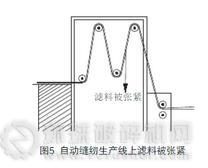 隨著縫制技術(shù)的發(fā)展,目前濾袋縫制也有了全自動(dòng)生產(chǎn)的縫紉設(shè)備,一旦初步調(diào)試完成,縫制過(guò)程中就很少需要人工操作了。在一般氈料濾袋的縫制中可廣泛應(yīng)用。但在縫制覆膜濾袋時(shí),則要謹(jǐn)慎使用自動(dòng)縫紉設(shè)備。因?yàn)椋谧詣?dòng)縫紉設(shè)備上,濾袋在縫制之前是需要張緊成型的(如圖5所示),在設(shè)置這個(gè)張緊力時(shí)就特別需要考慮到對(duì)濾料表層覆膜的保護(hù),否則極易造成覆膜因張力過(guò)大或與張緊輥摩擦而破損。