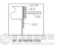 用袋口彈性圈實(shí)現(xiàn)濾袋安裝的外濾式濾袋袋口結(jié)構(gòu)如圖6所示。袋口彈性圈封在外濾式覆膜濾袋的上口,由彈性不銹鋼環(huán)或碳鋼環(huán)與濾料制成的嵌條組成。用手可將彈性圈壓扁,卡在花板口內(nèi),用手將彈性圈回彈至環(huán)形原狀,可聽(tīng)到清脆的“啪”一聲,此時(shí)袋口嵌條便與花板口卡緊。濾袋袋口與花板口必須緊密安裝好,濾袋在花板口內(nèi)不能轉(zhuǎn)動(dòng)。然而袋口彈性圈的制作也須注意很多細(xì)節(jié),否則不僅起不到安裝省力的效果,還有可能造成因配合不恰當(dāng)而發(fā)生漏灰甚至掉袋的現(xiàn)象。
