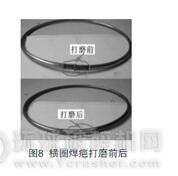 但這樣一來(lái),橫圈本身的焊點(diǎn)在清灰過(guò)程中就將與濾袋的內(nèi)表面直接接觸,為了避免因此接觸而造成的焊疤摩擦損壞濾袋,可增加一道橫圈的整理工序,去除橫圈焊疤的毛刺、凹凸不平,使橫圈焊接表面也保持光滑(如圖8),然后再與框架的豎筋焊接。這樣就可避免濾袋內(nèi)表面在過(guò)濾清灰過(guò)程中與此焊點(diǎn)的摩擦損壞。橫圈的質(zhì)量在很大程度上會(huì)對(duì)框架質(zhì)量造成影響,所以應(yīng)制定一套質(zhì)量保證體系來(lái)保證橫圈的直徑和圓度。