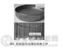 為了更好地避免框架表面對(duì)覆膜濾袋的損傷,在框架底托的邊緣,應(yīng)增加一道倒角工序,這樣底盤邊緣在壓入框架豎筋間隙后,在與豎筋的接觸面上沒(méi)有突出的刮口,就可進(jìn)一步減少濾袋與框架間磨損的可能性(如圖9)。