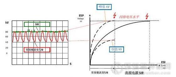 1、設(shè)計(jì)院的專家推薦高頻電源,但有些學(xué)者認(rèn)為認(rèn)為:目前在國內(nèi)范圍內(nèi)大量推廣的高頻電源并不能提高除塵效率,廠家誤導(dǎo),相反會(huì)降低除塵效率,高頻電源只是節(jié)能(甚至有專家認(rèn)為連節(jié)能也達(dá)不到)。專家指出目前國內(nèi)高頻電源廠家所宣傳的高頻電源由于低頻電源的波形圖(下圖一)來自于國外實(shí)驗(yàn)室內(nèi),并沒有國內(nèi)機(jī)組300MW或600MW的實(shí)際圖形,采用高頻電源后,電源功率會(huì)難以滿足,目前只適合于小電流電場(末電場)。并舉例說明:山西大同二電1000MW機(jī)組,除塵器采用高頻電源,灰分大時(shí),高頻電源放不出電,電流極低,造成煙道、電場堵灰,難以處理。龍凈在改造時(shí)考慮高頻電源功率的問題將一電場一分為二來解決。