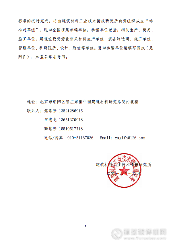 為使制定標(biāo)準(zhǔn)的內(nèi)容更加科學(xué),具有廣泛的適用性和代表性,保證標(biāo)準(zhǔn)的按時(shí)完成,將由建筑材料工業(yè)技術(shù)情報(bào)研究所負(fù)責(zé)組織成立“標(biāo)準(zhǔn)起草組”,現(xiàn)向全國(guó)征集參編單位,參編單位包括:相關(guān)生產(chǎn)、貿(mào)易、施工單位;建筑垃圾資源化相關(guān)材料生產(chǎn)單位、裝備制造商、施工單位、管理單位、科研院所、設(shè)計(jì)、質(zhì)檢等單位。意向參編單位請(qǐng)?zhí)顚懟貓?zhí)(見附件),加蓋公章后寄回。