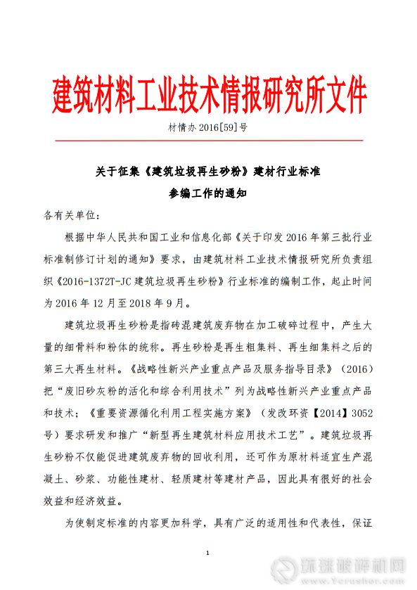 根據(jù)中華人民共和國(guó)工業(yè)和信息化部《關(guān)于印發(fā)2016年第三批行業(yè)標(biāo)準(zhǔn)制修訂計(jì)劃的通知》要求,由建筑材料工業(yè)技術(shù)情報(bào)研究所負(fù)責(zé)組織《2016-1372T-JC建筑垃圾再生砂粉》行業(yè)標(biāo)準(zhǔn)的編制工作,起止時(shí)間為2016年12月至2018年9月。