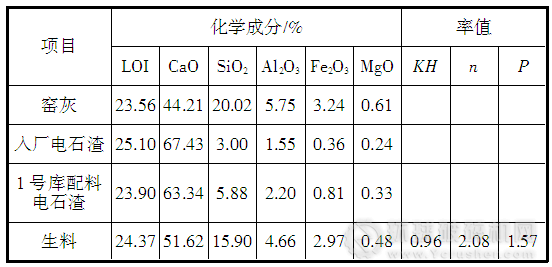 從表1可以看出,入廠的電石渣與配料所用的電石渣差異比較明顯,氧化鈣含量相差約4%,這還是在電石渣烘干工藝穩(wěn)定的前提下,如果不穩(wěn)定,差距將更加明顯,因為隨著窯灰摻入量的加大,配料的電石渣氧化鈣含量必然會降低。