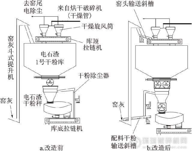 1)通過對1號電石渣計量秤的技改,將部分緩沖倉的電石渣經(jīng)收集通過架設配料干粉輸送斜槽入窯灰斗式提升機和窯灰混合均勻一起入1號電石渣庫,可以達到提升窯灰品質(zhì)的目的。