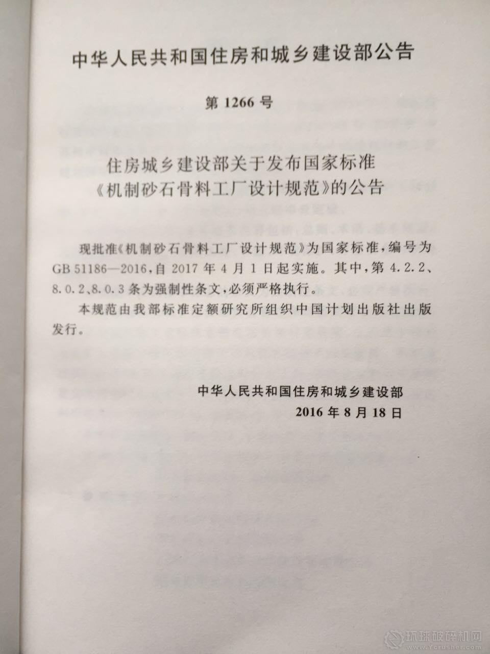 蘇州中材非金屬礦工業(yè)設(shè)計(jì)研究院有限公司、中國建筑材料工業(yè)規(guī)劃研究院共同主編的《機(jī)制砂石骨料工廠設(shè)計(jì)規(guī)范》由中華人民共和國住房和城鄉(xiāng)建設(shè)部、中華人民共和國國家質(zhì)量監(jiān)督檢驗(yàn)檢疫總局聯(lián)合發(fā)布,2017年4月1日實(shí)施。