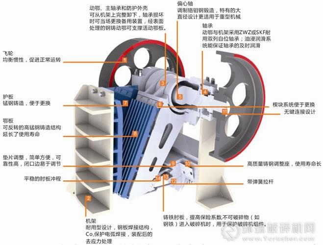 固定裝置的主要部件式機器,機器的制造工藝由兩種;中碳鋼鑄造機架和中碳鋼鋼板焊接機架。焊接機架是在原鑄造機架的基礎(chǔ)上又增加了多條強筋,并通過嚴(yán)格的質(zhì)量控制和特定的工藝要求,達(dá)到與鑄造機架 相同的使用效果.為了防止機架側(cè)壁的嚴(yán)重磨損,在鄂式破碎機 腔左右側(cè)壁上裝有護(hù)板,可隨意更換。