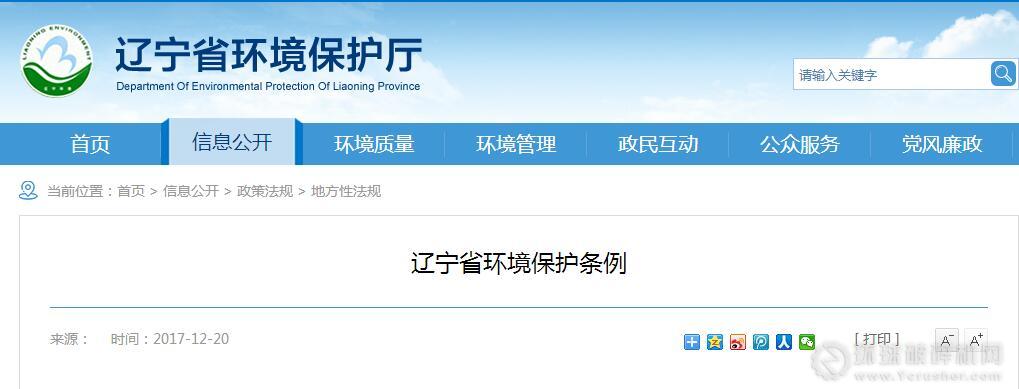 《遼寧省環(huán)境保護(hù)條例》已由遼寧省第十二屆人民代表大會(huì)常務(wù)委員會(huì)第三十八次會(huì)議于2017年11月30日審議通過,現(xiàn)予公布。本條例自2018年2月1日起施行。