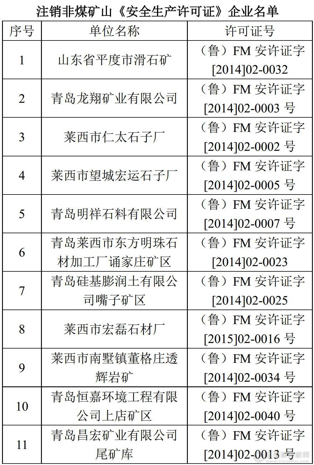 4月20日,山東省安監(jiān)局發(fā)布《關(guān)于注銷山東省平度市滑石礦等11家非煤礦山安全生產(chǎn)許可證的批復(fù)》,同意注銷山東省平度市滑石礦、青島硅基膨潤土有限公司嘴子礦區(qū)等11家企業(yè)非煤礦山安全生產(chǎn)許可證。
