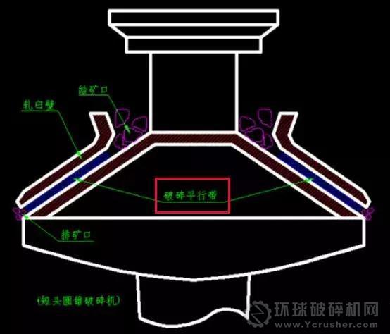 平行碎礦區(qū)是圓錐破碎機(jī)粒度均勻的保證區(qū)域。破碎能力與平行區(qū)的料層厚度有關(guān),料層厚度和排礦口的大小也有直接的關(guān)系。平行區(qū)長度增加,有利于粒度的控制,但排礦能力相對(duì)減小;平行區(qū)長度減小,有利于排礦,但碎礦粒度不易保證。