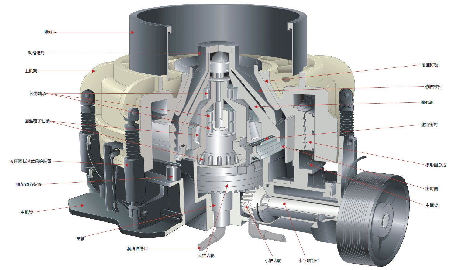 破碎機(jī)耐磨襯板的更換方法:當(dāng)破碎機(jī)錐體下部襯板裝上后,利用錐體下部的調(diào)整圈,使下部襯板與錐體之間保持l.0~2.0mm的間隙。最上面的襯板裝上后,應(yīng)先將壓緊螺母裝上,然后再澆鑄鋅合金。澆鑄前,錐體與襯板先預(yù)熱60~80℃,襯板各接頭的縫隙要用石棉及黏土塞住,以免鋅合金漏出。襯板澆完合金后,裝上壓緊螺母和鎖緊板,使之緊緊固定。
