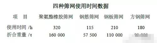 由于各個系統(tǒng)的巖石性質(zhì)及生產(chǎn)工況的不同,篩網(wǎng)使用壽命也會存在一定的差異,為了更好的對四種不同篩網(wǎng)使用壽命進(jìn)行比較,現(xiàn)只針對四種篩網(wǎng)在某人工骨料加工系統(tǒng)的使用情況進(jìn)行比較。