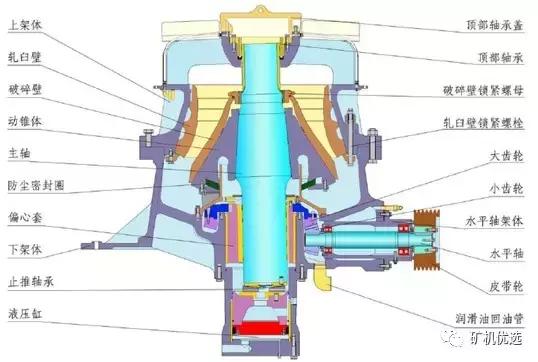 單缸液壓圓錐破的結(jié)構主要分為六大部分:(1)上機架總成;(2)下機架總成;(3)動錐總成;(4)傳動軸總成;(5)偏心套總成;(6)液壓缸總成。其輔助部分,由電氣系統(tǒng)、稀油潤滑系統(tǒng)組成。