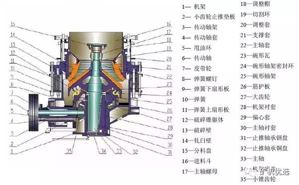 彈簧圓錐破從結(jié)構上主要分為六大總成:定錐總成、動錐總成、傳動總成、彈簧機構、碗型軸架部、機架總成。其輔助部分,由電氣系統(tǒng)、稀油潤滑系統(tǒng)組成