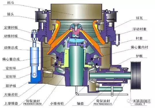 多缸液壓圓錐破有以下六大部分:(1)下機架部:機架主軸導向銷;(2)偏心套部:偏心套平衡圈大錐齒輪;(3)傳動部:傳動軸小錐齒輪軸套;(4)支撐套部:支撐套鎖緊缸鎖緊螺母;(5)調(diào)整環(huán)部:調(diào)整環(huán),軋臼壁;(6)動錐部:軀體
