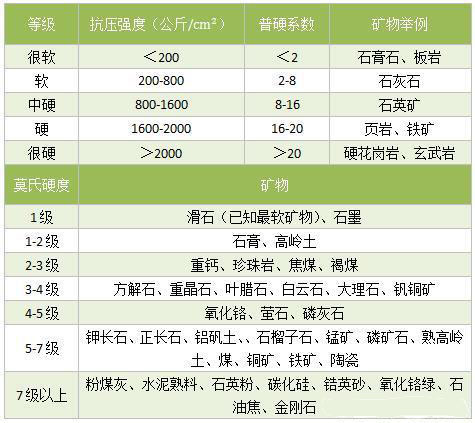 粉磨越難,設(shè)備磨損越嚴(yán)重;普氏硬度越高,抗壓強(qiáng)度越高,破碎難,磨損嚴(yán)重。常見物料的硬度情況如下表所示: