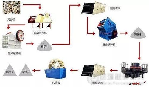 在兩段破碎工藝?yán)铮耙欢螢殚_路生產(chǎn),后一段為閉路生產(chǎn),閉路生產(chǎn)可以平均調(diào)配各種級別的石頭。