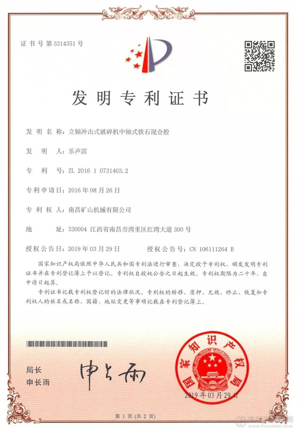 南昌礦機《立軸沖擊式破碎機中軸式鐵石混合腔》喜獲國家發(fā)明專利!