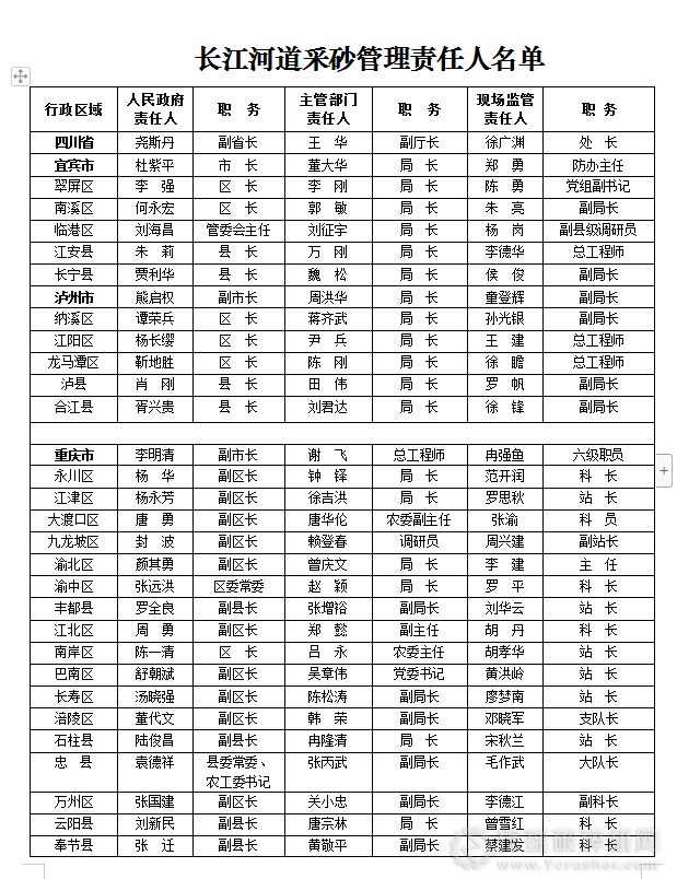 為了促進長江采砂管理工作,有效落實長江采砂管理責任制,長江沿線各地確定了采砂管理各河段河長和各級人民政府、水行政主管部門、現(xiàn)場監(jiān)管及行政執(zhí)法責任人名單,特向社會公告。