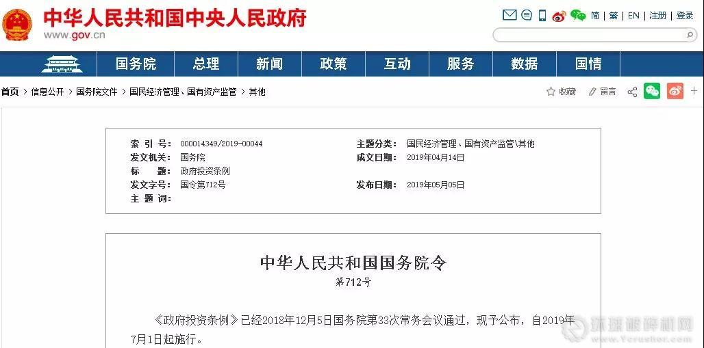 《政府投資條例》已經(jīng)2018年12月5日國(guó)務(wù)院第33次常務(wù)會(huì)議通過,現(xiàn)予公布,自2019年7月1日起施行。