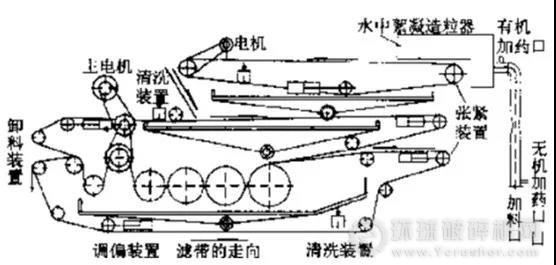 帶式壓濾脫水機主要由濾帶、輥壓筒、張緊裝置、調(diào)偏裝置、沖洗裝置和驅(qū)動裝置組成,如下圖所示。